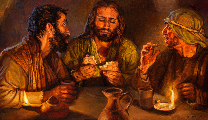 That very day two of them were going to a village named Emmaus, about seven miles from Jerusalem, 14 and they were talking with each other about all these things that had happened. 15 While they were talking and discussing together, Jesus himself drew near and went with them. 16 But their eyes were kept from recognizing him. 17 And he said to them, “What is this conversation that you are holding with each other as you walk?” And they stood still, looking sad. 18 Then one of them, named Cleopas, answered him, “Are you the only visitor to Jerusalem who does not know the things that have happened there in these days?” 19 And he said to them, “What things?” And they said to him, “Concerning Jesus of Nazareth, a man who was a prophet mighty in deed and word before God and all the people, 20 and how our chief priests and rulers delivered him up to be condemned to death, and crucified him. 21 But we had hoped that he was the one to redeem Israel. Yes, and besides all this, it is now the third day since these things happened. 22 Moreover, some women of our company amazed us. They were at the tomb early in the morning, 23 and when they did not find his body, they came back saying that they had even seen a vision of angels, who said that he was alive. 24 Some of those who were with us went to the tomb and found it just as the women had said, but him they did not see.” 25 And he said to them, “O foolish ones, and slow of heart to believe all that the prophets have spoken! 26 Was it not necessary that the Christ should suffer these things and enter into his glory? ”27 And beginning with Moses and all the Prophets, he interpreted to them in all the Scriptures the things concerning himself. 28 So they drew near to the village to which they were going. He acted as if he were going farther, 29 but they urged him strongly, saying, “Stay with us, for it is toward evening and the day is now far spent.” So he went in to stay with them. 30 When he was at table with them, he took the bread and blessed and broke it and gave it to them. 31 And their eyes were opened, and they recognized him. And he vanished from their sight. 32 They said to each other, “Did not our hearts burn within us while he talked to us on the road, while he opened to us the Scriptures?” 33 And they rose that same hour and returned to Jerusalem. And they found the eleven and those who were with them gathered together, 34 saying, “The Lord has risen indeed, and has appeared to Simon!” 35 Then they told what had happened on the road, and how he was known to them in the breaking of the bread.